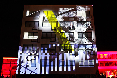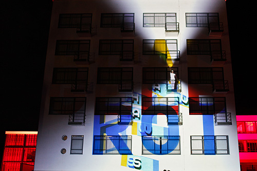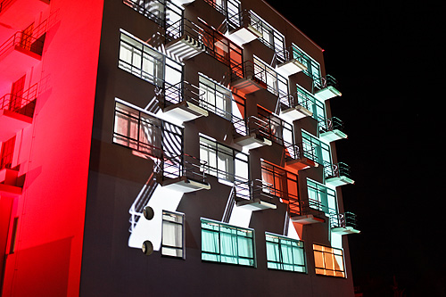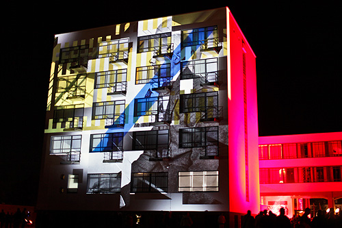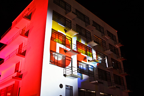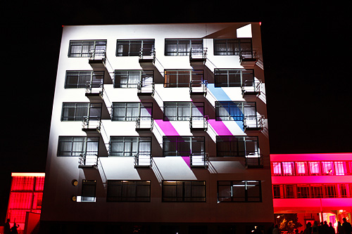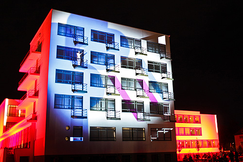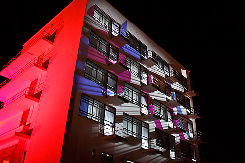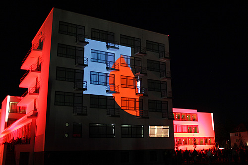 An architectural staging of the Bauhaus Prellerhaus facade in Dessau, Germany. It was performed on the 5th of september 2009 in the context of the "12. Farbfest Rot".